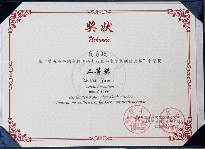 5月18日,第五届全国高校德语专业本科生学术创新大赛全国总决赛在浙江大学圆满落幕。我校外国语学院2021级德语专业学生周宇敏的作品《跨区+跨境电商背景下中国农产品外宣德译策略研究》荣获全国二等奖。指导老师朱越荣获“优秀指导教师”称号。