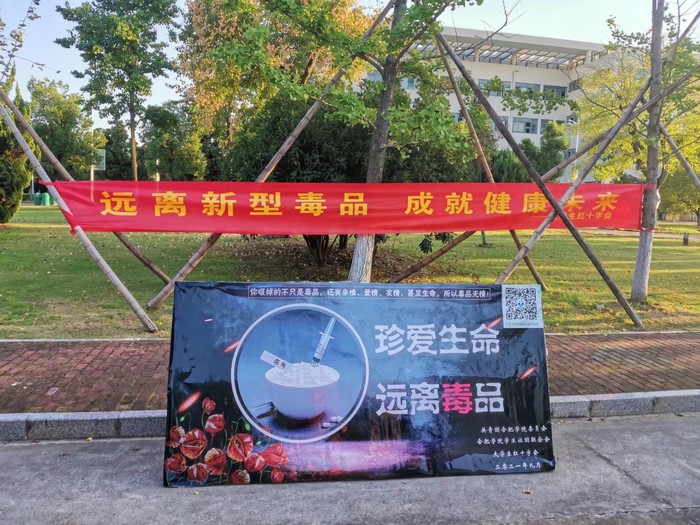 我校是合肥市禁毒高校联盟成员校之一,此次禁毒宣传教育活动依托我校大学生红十字会组织开展,在一期和二期校园内分别开设宣传点,摆放禁毒宣传教育海报和横幅。红十字会的志愿者们通过现场讲解毒品危害常识、举办毒品危害知识小问答、发放合肥市禁毒办统一制作的宣传小礼品等形式开展宣传教育活动,引导同学们关注国家禁毒的官方微信公众号,呼吁同学们提高毒品危害意识,自觉远离毒品。宣传期间,我校学生参与度高,主动了解有关毒品危害的知识,积极转发大学生红十字会官方平台的禁毒宣传文案,活动现场,很多同学在禁毒横幅和宣传展板上签名。
