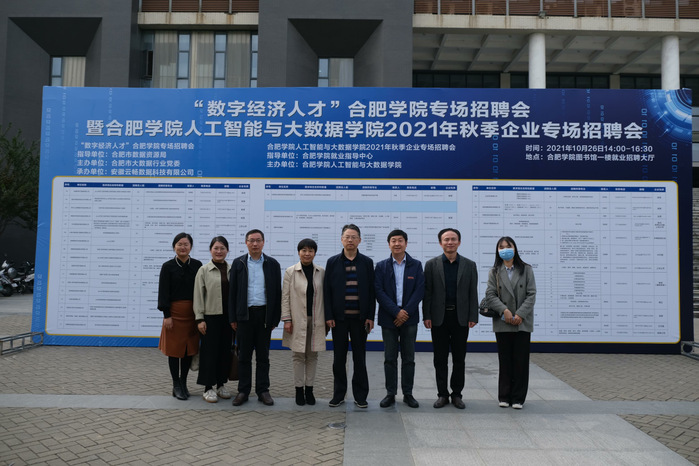 为推动毕业生更加充分更高质量就业,10月26日,人工智能与大数据学院于图书馆一楼就业招聘大厅走廊举办 “数字经济人才”合肥学院专场招聘会暨人工智能与大数据学院2021年秋季企业专场招聘会,本次招聘会得到了合肥市数字资源局的大力支持。合肥市数据资源局三级调研员申林,我校党委委员、学生工作部部长朱涛,人工智能与大数据学院党委书记牛欣、院长檀明、党委副书记储昭辉到现场检查指导工作。