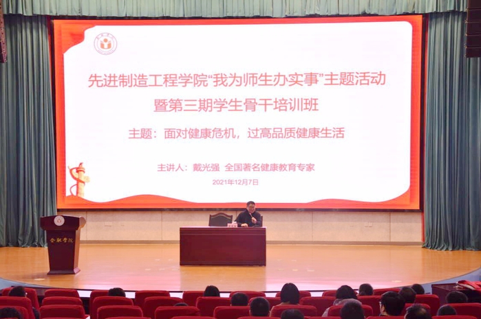 为结合党史学习教育,深化“我为师生办实事”主题活动开展,帮助师生养成良好健康的生活习惯,树立正确生活理念,12月7日下午,我校先进制造工程学院在图书馆报告厅举办“我为师生办实事”主题活动,邀请全国著名健康教育专家戴光强教授来我校作健康知识专题讲座,本次讲座以“面对健康危机,过高品质健康生活”为主题,先进制造工程学院全体教职工和学院学生骨干培训班全体学员聆听讲座。讲座由先进制造工程学院党委书记杜娟主持。