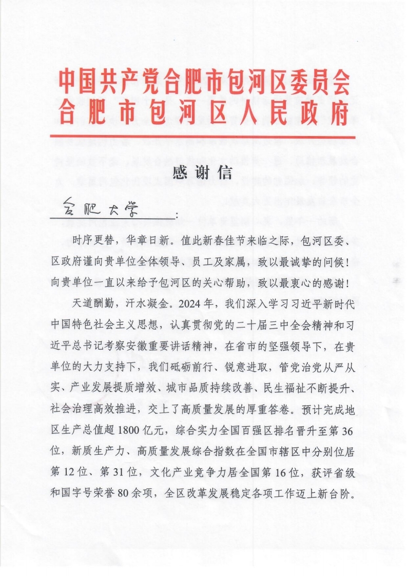 正值岁末,我校收到了来自合肥市包河区委区政府发来的感谢信。信中,包河区委区政府对我校给予包河区的关心帮助致以衷心感谢。