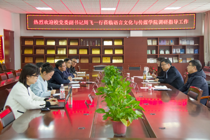 3月13日上午,党委副书记周飞赴语言文化与传媒学院走访调研,与学院领导班子成员和教师代表座谈交流,深入了解学院发展情况,指导学院高质量发展。