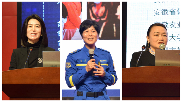 在主题分享环节,三位来自不同领域的巾帼榜样依次登台,讲述实干担当、突破自我的成长之路。安徽源泽智能科技有限公司董事长伍茶香分享了从技术骨干到企业掌舵者的创业历程,展现科技女性在智慧金融、人工智能等领域的敏锐洞察与创新实践;安徽誉阳控股集团董事长沈欣以“向下扎根、向上生发”为主题,讲述了带领团队打造70多个乡村振兴项目的探索经验,诠释了女性在乡村建设与产业融合中的独特价值;合肥市蓝天救援队队长苏琴则结合多年来参与国内外重大救援的实战经历,展现了女性在应急救援中的专业力量与温暖担当,并鼓励大家“做不被定义的自己”。