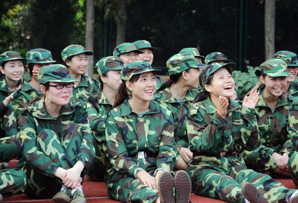 “稍息,立正,向右看齐——”,教官洪亮的口令声一响起,整齐的小碎步便随之迈起,队形在转瞬之间变得整齐划一,而后四周便安静得只剩下平缓的呼吸声了。整队完毕后,各连队便进入了站军姿、齐步、正步等紧张训练中。“虽然每次训练都很累,但这却使我认识了许多人,令我很快乐、很开心。”外语系的严敏同学在休息期间这样说道,其实军训并没有想象中的那么累,而且天气也不热。