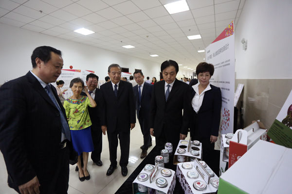 在展出现场,台湾两岸和平发展联合会主席蓝博洲、铭传大学校长李铨、台湾抗日志士亲属协进会创会会长林光辉、海峡两岸关系协会副会长孙亚夫、安徽省政府副省长谢广祥、安徽省台办副主任汪泗淇、合肥市委副书记凌云、合肥学院党委书记蔡敬民、合肥学院校长张文兵等认真参观了学生们的设计作品。