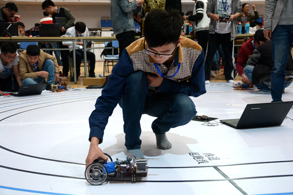 在开幕式顺利举办后,本次大赛于体育馆主馆正式开始。各参赛队伍在仿人机器人短跑比赛、仿人机器人单人或多人舞蹈比赛、智能停车购物等10个大项、12个小项间展开激烈角逐。我校来自计算机科学与技术系卓越IT工程师俱乐部、由计科系教师高玲玲、张贯虹指导的四支队伍参与此次大赛。比赛现场选手们皆心无旁骛,全神贯注,不断调试数据,力争让参赛机器人发挥出最佳水平。经过历时近两日的比拼,比赛最终落下帷幕,我校代表队分别在仿人机器人短跑比赛与仿人机器人障碍跑比赛中荣膺冠军。