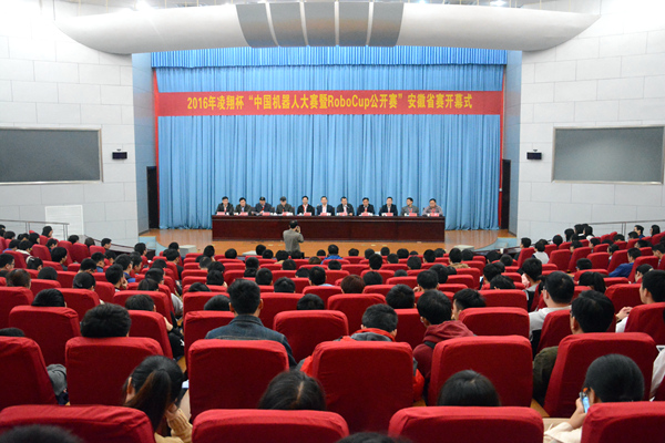 4月9日,由安徽省教育厅主办,合肥学院、合肥工业大学 、安徽省高等学校计算机教育研究会联合承办的2016 年凌翔杯“中国机器人大赛暨 RoboCup 公开赛”安徽省赛于我校图书馆学术报告厅A厅隆重揭幕,经过激烈角逐,次日大赛于体育馆主馆圆满落幕。我校党委副书记、校长张文兵、安徽省教育厅高教处副处长梁祥君,合肥工业大学教务部副部长、创新创业教育中心主任黄景荣等出任大赛组委会成员并于开幕式致辞。来自全省各所高校的众多队伍参与此次比赛。