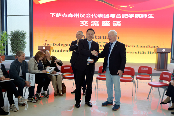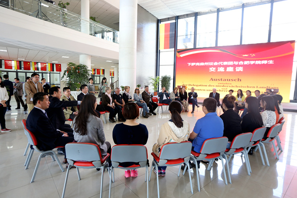 下萨克森州议会代表团与我校师生开展了交流座谈。我校经济系徐刚等留德回国教师代表、张毅等留学回国创业人员代表及中德物流、德语等专业学生代表参与了此次交流会。会上,学生代表与德国朋友就赴德国学习、生活及工作方面展开了交流与讨论,加布里勒·安德雷副议长对学生们的问题给予了相关的建议与回答。留德教师代表介绍了自己在德国学习的感受,强调了跨文化交流及应用型企业合作等方面的点滴感悟,同时希望我校能够与德国进行长期合作和友好往来。布泽曼议长表示,能够在遥远的中国与这些会说德语、了解德国的青年师生们进行交流,机会难得,这也反映了合肥学院对德合作的浓烈氛围,让他觉得非常温馨。最后,宾主一行在我校二期校区共同种下了象征两州省友谊的常青松柏,并在树前合影留念。