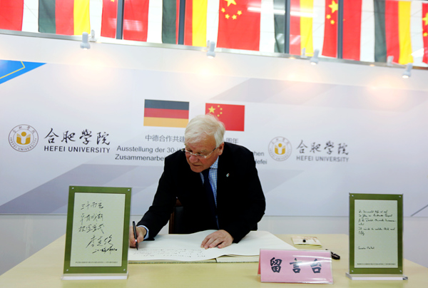 4月19日,德国下萨克森州议会议长伯恩特·布泽曼率领的德国下萨克森州议会代表团在安徽省人大常委会副主任王翠凤的陪同下莅临我校访问,校党委书记蔡敬民、校长张文兵在图书馆大厅举行了欢迎仪式。德国驻沪总领事罗滕出席活动。蔡敬民、张文兵陪同代表团一行参观了我校中德共建三十周年成果展,布泽曼议长在留言薄上写下对我校的衷心祝福。