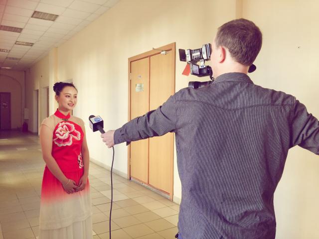 5月15日,在我校与俄罗斯青年合唱团、莫斯科室内合唱团、俄罗斯混声合唱团、俄罗斯女子合唱团等五个知名合唱团体联袂演出之前,新华社俄罗斯分社记者专程来到我校合唱团排练室,再次采访了许刚和合唱团学生成员朱田园,两人分别从学校的基本情况介绍、学校领导的支持与重视、合唱团训练前期的筹备,歌曲的选择,参与活动的意义和收获,国际艺术节对国家青年交流和对外文化交流方面的意义等进行了介绍。新华社俄罗斯分社记者还特意在演出现场录制了我校合唱团演唱的《彩云追月》、《回娘家》等中国民族歌曲,并在闭幕式现场对我校合唱团进行了节目跟拍。
