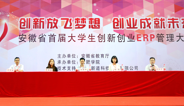 6月25日,由安徽省教育厅主办、合肥学院承办的安徽省首届大学生创新创业ERP管理大赛开幕式在我校体育馆成功举行。安徽省大学生创新创业教育办公室秘书陈星,合肥学院副校长刘建中、大学生创新创业教育办公室主任刘沛平,用友集团新道科技股份有限公司安徽分公司总经理李珊珊出席本次开幕式。经过各高校的校内选拔,来自合肥工业大学、安徽建筑大学等24所院校的46支参赛队伍将在此展开激烈角逐。