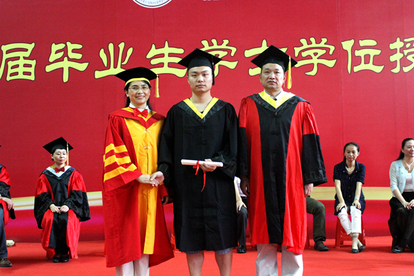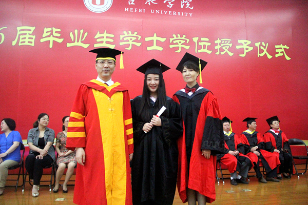 各系毕业生身着学士服依次上台,从系学位委员会主任手中领过印有“合肥学院”字样的学位证书,校领导们亲手为毕业生拨正流苏,并合影留念。