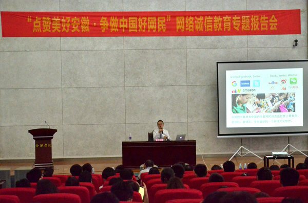 6月30日下午,由省网信办、团省委主办,校团委承办的“点赞美好安徽·争做中国好网民”网络诚信教育专题报告会在我校图书馆学术报告厅B厅举行,中国传媒大学传播学部吴炜华教授担任主讲嘉宾。安徽省互联网宣传管理办公室副主任陈鹏运、团省委宣传部部长刘存磊,校党委委员、宣传部部长刘樟树,校学生处处长董承军,校团委副书记杜娟及各系学生代表200余人现场聆听了讲座。讲座由省网信办副主任陈鹏运主持。