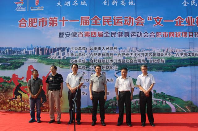 为贯彻落实全民健身国家战略,展示我市现代化滨湖大城市建设成就和合肥人民昂扬向上、奋发进取的精神风貌,进一步提高市民身体素质、健康水平,推动体育事业健康协调快速发展。2016年8月5日上午由合肥市人民政府主办,市体育局、合肥经开区、市体育总会承办的合肥市第十一界全民运动会网球比赛在合肥学院一期网球场隆重举行。合肥市体育局局长菅青、教体处处长余晖;经开区管委会副主任王家和、经开区社会发展局局长李应天、纪委书记时宗田;经开区体育总会主席吴峰、合肥学院督导郑永红等重要来宾出席了本次开幕式。
