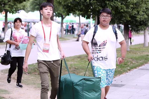在学校各门口、咨询服务点、各系报到处、新生宿舍,随处可以看到志愿者们忙碌的身影,为新生及家长提供校园引导、报到咨询、行李运送、临时休息等新生服务。他们身着统一的服装,配带志愿者证穿梭奔波在校园里,像一面面飘扬的旗帜,为新生指引着方向。有的在路口为新生指路,带领他们去迎新点办理报到手续;有的在迎新点志愿服务,帮助新生完成报到流程;有的在迎新点旁边等待,帮助新生搬运行李,给家长送来茶水;有的则在宿舍楼内为新生发放和搬运卧具,为新生提供便利。