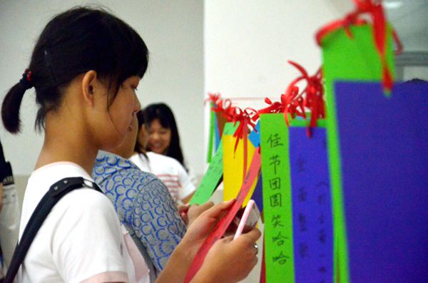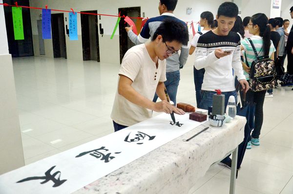 活动现场人头攒动,热闹非凡,极具华夏礼仪文化的传统汉服展现了赫赫威仪,翩翩神采。由汉宣社推出的具有浓郁古典气息的汉舞表演一出场便吸引了大量的观众注目,身着一袭丹青绿色的古代长袖舞衣,伴随着悠扬的歌曲翩翩起舞,袅袅如束丝的细腰舞动,宛若水波纹的长袖挥动着,刚柔兼济,尽展古代女子的婀娜妩媚。虽然细雨微朦,不见月光,但中秋团圆氛围感染了在场的学生。汉服拜月仪式,穿着汉服的司仪宣布拜月仪式开始,“主献”和“从献”各自入位,按着“通赞”的口令上香、祭酒,现场每个人都在非常认真地观看仪式。“很久没有看到用传统方式来传承弘扬传统文化,不负此行!”现场的一位同学说道。此外,书法传承着悠久的民族记忆,现场书写毛笔字的翰墨轩学生引得众多观众驻足欣赏,行云流水,洋洋洒洒的挥毫,令现场叹为观止。伴随着一张张笑靥,一声声笑语,中秋之夜活动在欢乐融融的气氛中圆满结束。