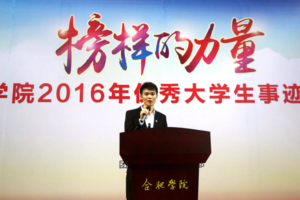 第十一届榜样学子分别为2016级全体新生们做了精彩的报告,分享了自己大学生活的收获和体会。社会实践类榜样学子左中壮认为,实践出真知,只有踏实走好每一步,勿忘初心,才能在平凡中成就不平凡。体育锻炼类榜样学子王炳介绍了自己在击剑、武术等体育项目中,学校对他的培养和靠集体拼搏为学校争取的荣光。志愿服务类典型李彪讲述了自己三年前无数次的志愿服务经历,完美诠释了志愿服务精神。“一个女孩美好的外表固然能使人眼前一亮,但丰富的内涵才能让人经久不忘。”自强奋斗类榜样学子韩沁说,身体上的缺陷不是博得同情的资本,她将继续用微笑感染他人,用努力去实现梦想。科技创新类榜样学子黄蓉分享了自己大学后投身科技创新的心路历程,希望大家能找准定位,明确方向,做到青春无悔。道德模范类榜样学子马小涵分享了自己以身示范,爱老敬老,品学兼优的成长历程;毕业生席宏飞、史一彬、王梦婷也分别讲述了大学四年自强奋斗、学生工作和创新创业的心得感触。