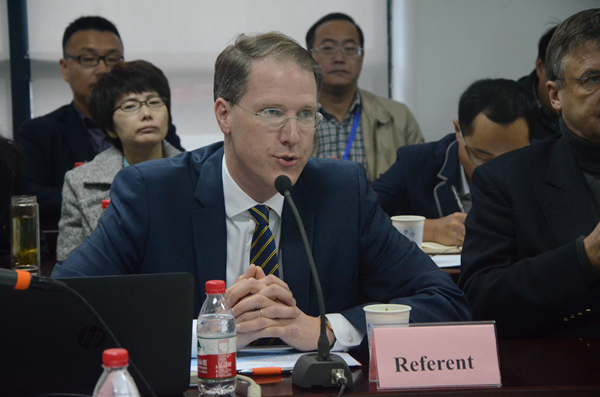 第一分会场交流由埃姆登/里尔应用科学大学校长盖尔哈德·克罗伊茨教授与邯郸学院校长马计斌教授、奥斯纳布吕克应用科学大学中德物流管理专业负责人米歇尔·舒勒教授主持。德累斯顿学院前校长迪特勒夫·克鲁普林教授、北京联合大学教务处长齐再前教授、奥斯纳布吕克应用科学大学中德物流管理专业负责人米歇尔·舒勒教授、China Window 国际智库首席研究员高鹏博士、铜陵学院校长倪国爱教授分别就应用型人才培养模式改革展开深入探讨。