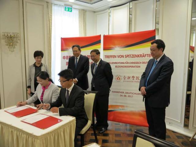 Am Vormittag des 14.06. fand ein Treffen von Spitzenkräften der Modelleinrichtung der Bildungskooperation zwischen China und Deutschland in Hannover statt. Prof. Dr. Cai Jinmin, Parteisekretär der Universität Hefei, hielt dabei eine Rede. Dr. Li Jinbin rechnete in seiner nachfolgenden Rede der Universität Hefei hoch an, dass sie als Brücke bei der Förderung der chinesisch-deutschen Bildungskooperation eine wichtige Rolle spiele. Er zitierte Ministerpräsident Li Keqiang und teilte seine Hoffnung, dass die Kooperationen der Universität Hefei auch in Zukunft, so wörtlich „wie ein starker Baum mit tiefen Wurzeln“ sein mögen.