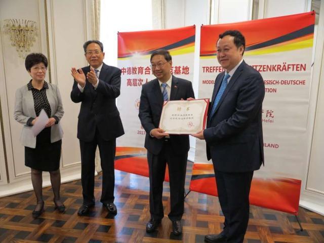 Herr Li Jinbin hob hervor, dass die Ernennung von Herrn Botschafter Shi Mingde zum Ehrenprofessor derUniversität Hefei den Aufbau der Modelleinrichtung zur Bildungskooperation beider Länder, sowie die Anwerbung qualifizierten Personals aus Deutschland in China zukünftig voranbringen wird.