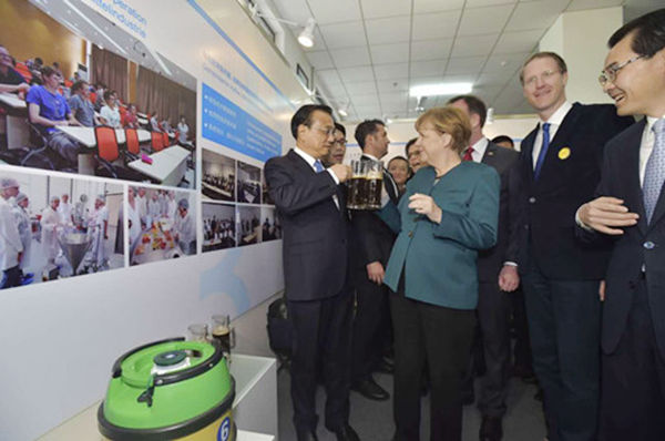 30日上午,李克强总理与德国总理默克尔在合肥学院食品专业交流合作展区共同品尝我校学生酿制的德国黑啤。(中国新闻网人民网消息)